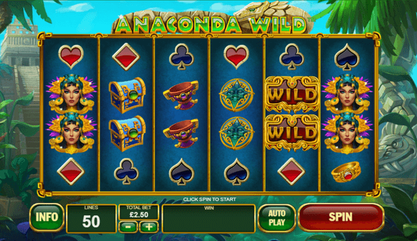 In Anakonda Wild, all 50 paylines remain active at all times. Players begin by selecting their total bet using the Total Bet menu. Spins may be launched manually using the Spin button or set to run automatically with Autoplay, which allows 10–99 spins or unlimited cycles until a feature activates.