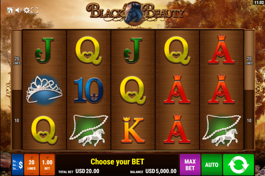Black Beauty is structured around five reels and three rows, offering 20 fixed paylines for winning combinations. Wins form from left to right, requiring at least 2 to 5 matching symbols depending on their value.