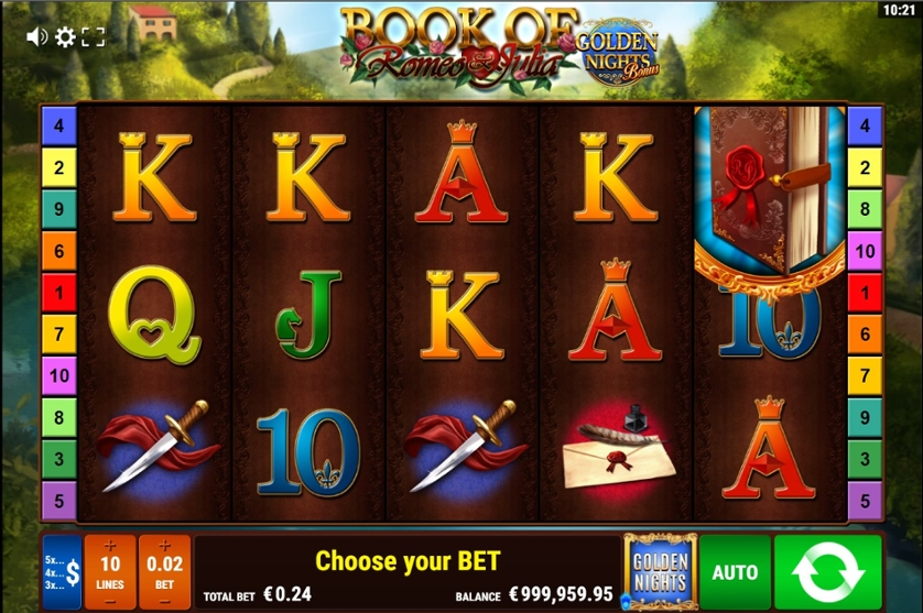 The Book of Romeo & Julia slot features a 5×3 reel grid and 10 adjustable paylines. Wins occur from left to right when 2 to 5 matching symbols land on a payline.