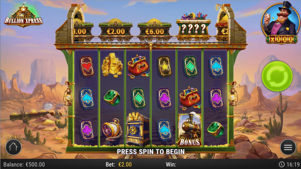 Bullion Xpress captures the adventurous charm of 19th-century train travel. Set against a sun-drenched, desert frontier, the reels spin to the rhythm of an upbeat, old-time Western soundtrack. Dust clouds rise as locomotives thunder by, their carriages brimming with treasures waiting to be seized. The visuals balance cartoonish charm with polished detail a playful yet cinematic depiction of the gold rush era.