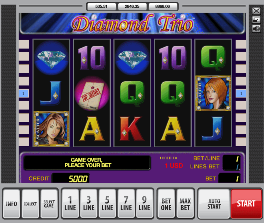 Diamond Trio is a sleek, spy-themed video slot from Greentube that drops players into a world of covert missions, luxury espionage, and high-stakes intrigue. Fronted by three fearless secret agents, the game blends classic slot mechanics with risk-driven features and lucrative bonus potential. Built on a 5×3 reel layout with up to 9 adjustable paylines, Diamond Trio follows a traditional structure while offering extremely high symbol multipliers that can reach an impressive 5,000× per line.