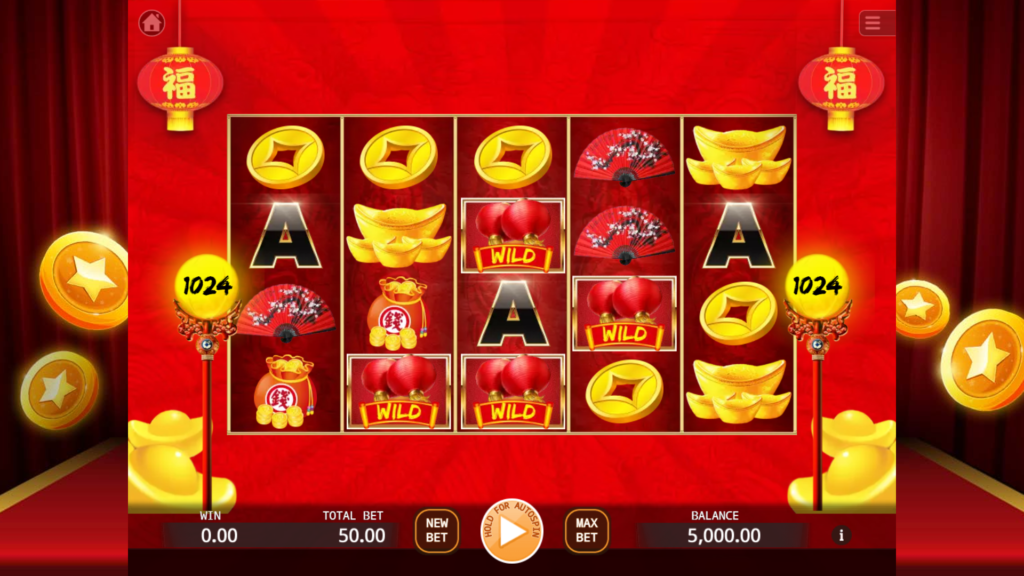 Winning combinations are formed by matching 2 to 5 identical symbols on adjacent reels from left to right. With 1024 ways to win instead of fixed paylines, players simply adjust their total bet using preset values, making gameplay fast and intuitive. The lantern wild substitutes for most symbols, while scatters and bonus icons unlock free spins and interactive bonus rounds.