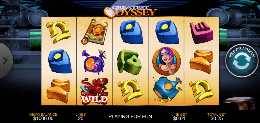 The Greatest Odyssey slot uses a traditional 5×3 layout with 25 fixed paylines, ensuring straightforward yet rewarding gameplay. Bets can be adjusted using the Line Bet option, ranging from 0.01 to 10 credits per line. Winning combinations form from left to right, consisting of 2 to 5 matching symbols.