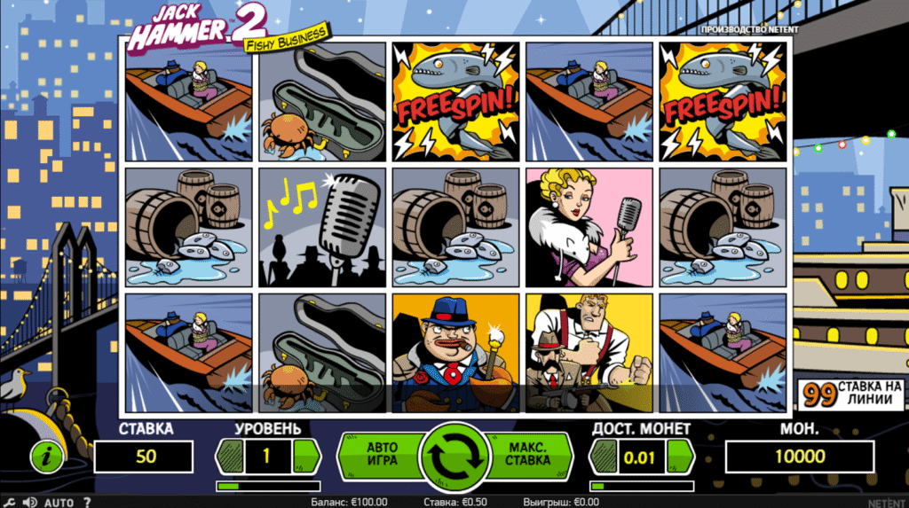 The Jack Hammer 2: Fishy Business slot machine offers a fast-paced, comic-inspired experience packed with engaging features and rewarding gameplay. The 99 paylines increase winning opportunities significantly compared to the original game, while the combination of Sticky Win and 2x multiplier Free Spins creates immense payout potential.