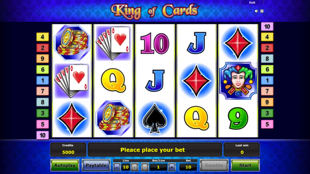 King of Cards offers a lively and classically satisfying gameplay rhythm where small pays appear frequently, while opportunities for big wins emerge through Joker Wild combinations and free spins with multipliers. The retro-style presentation maintains a nostalgic charm, while the risk gamble feature adds an extra layer of excitement for players who enjoy pushing their luck. With adjustable paylines and fast-paced reel movement, the game appeals to both new slot players and fans of classic Novomatic-style mechanics.