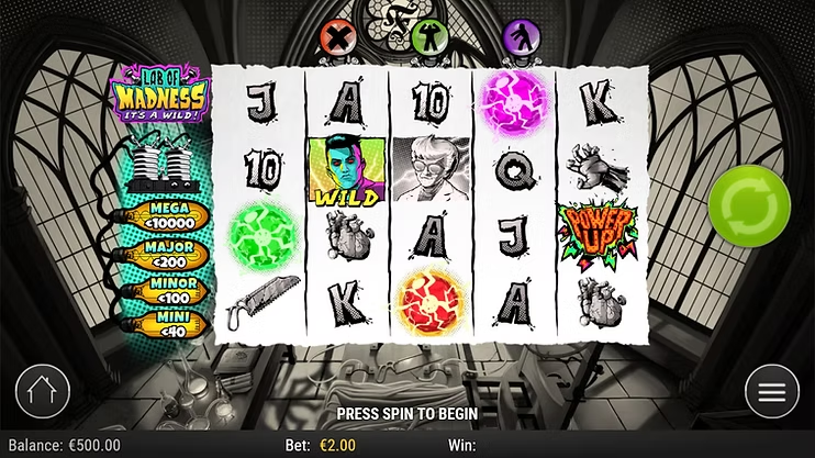 From the very first spin, Lab of Madness It’s A-Wild! immerses you in a black-and-white laboratory straight out of a 1930s horror film. Flickering lightbulbs, test tubes, and jagged shadows set the tone for a grim yet comic-book-like aesthetic. Every detail oozes gothic charm from bolts of neon energy to lightning flashing outside the window.