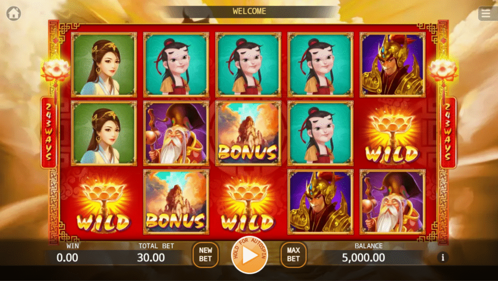 Lotus Lamp captures the elegance and spirit of traditional Asian artistry. The background showcases misty mountains, ancient bridges, and temple gates bathed in a golden glow. Each symbol from wise sages to warrior figures contributes to the game’s narrative of honor and enlightenment.