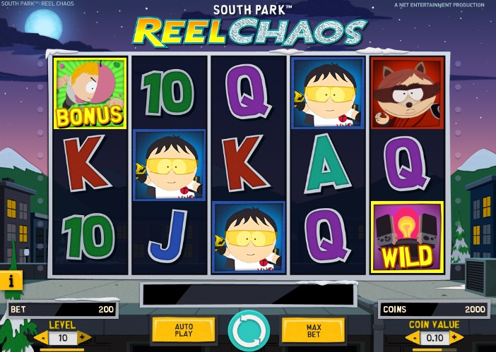 The South Park: Reel Chaos slot by NetEnt brings back the beloved heroes of the American cult animated series Kyle, Kenny, Stan, and Eric in a hilariously chaotic and action-packed adventure. This sequel slot offers players a mix of humor, creative bonus features, and massive payout potential. With 5 reels, 20 paylines, and a chance to win payouts with coefficients up to 1,000x per line, the game stands out as one of NetEnt’s most entertaining releases.