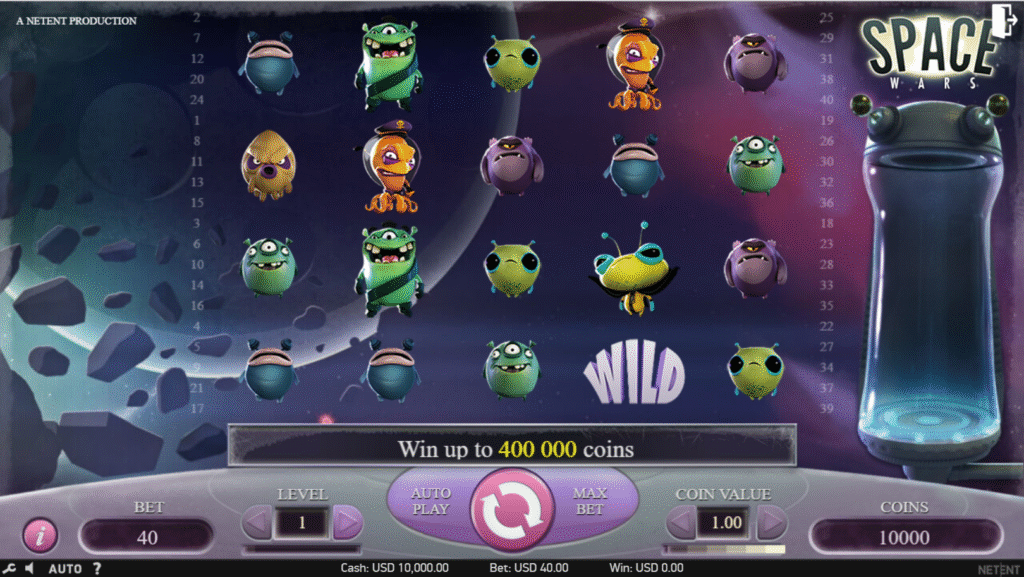 The Space Wars slot by NetEnt takes players on a thrilling intergalactic journey packed with quirky alien characters, futuristic visuals, and massive payout potential. This video slot combines cosmic humor with rewarding gameplay, offering up to 400,000 coins in winnings. Featuring 5 reels, 4 rows, and 40 fixed paylines, Space Wars captures the excitement of a galactic battle while keeping gameplay intuitive and full of energy.