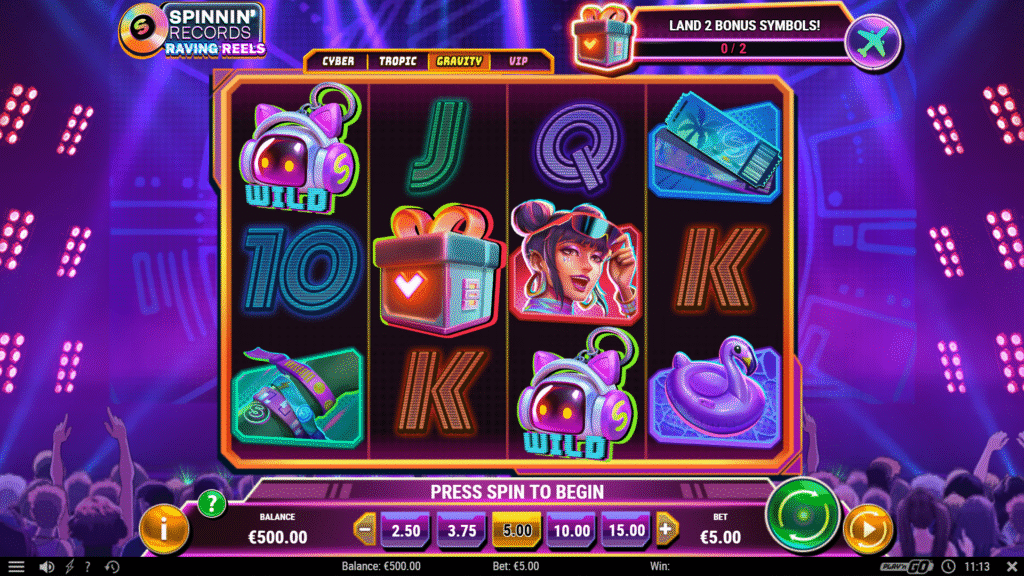 The goal in Spinnin’ Records Raving Reels is to line up matching symbols while unlocking new stages by triggering respins and collecting special symbols.