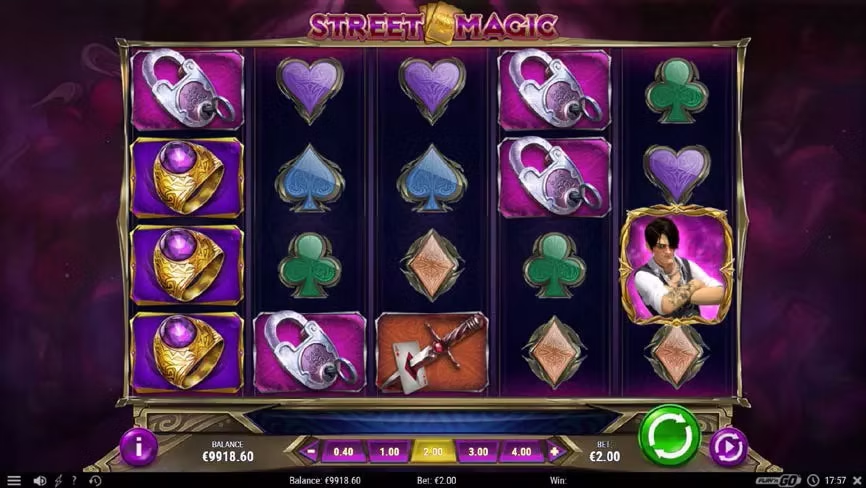 Street Magic features a balanced selection of symbols tied to magic, mystery, and escape artistry. Premium icons offer solid mid-value wins, while the ring symbol delivers the game’s strongest line payouts.