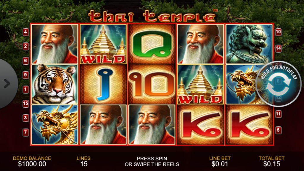 Thai Temple offers a traditional, intuitive interface that makes it easy for beginners and experienced players alike. Before spinning, players select their Line Bet and adjust the number of active paylines using the Lines menu. The Total Bet is automatically calculated (Line Bet × lines selected) and displayed clearly.