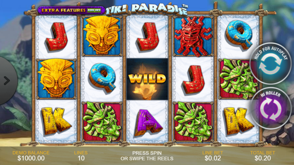 Tiki Paradise provides frequent small-to-medium wins, with larger payouts appearing through wild combinations and free spins. The Hi Roller option increases volatility slightly but improves access to bonus features and higher-paying outcomes.
